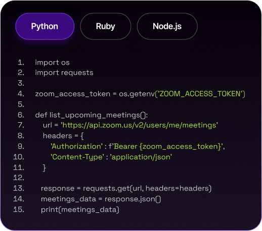 Deploy bots across Zoom, Teams, and Google Meet with just a few lines of code.